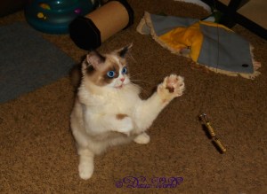Dezi: Me isn’t crazy ‘bout brushin’, but every once in while me will tolerate it cuz mommy seems to really enjoy it. Me hasn’t had those dirty bloomers in quite some time, so fankfully mommy doesn’t have to clean me up anymore. Generally speakin’ Ragdolls are purretty low maintenance, considerin’ all our furs.