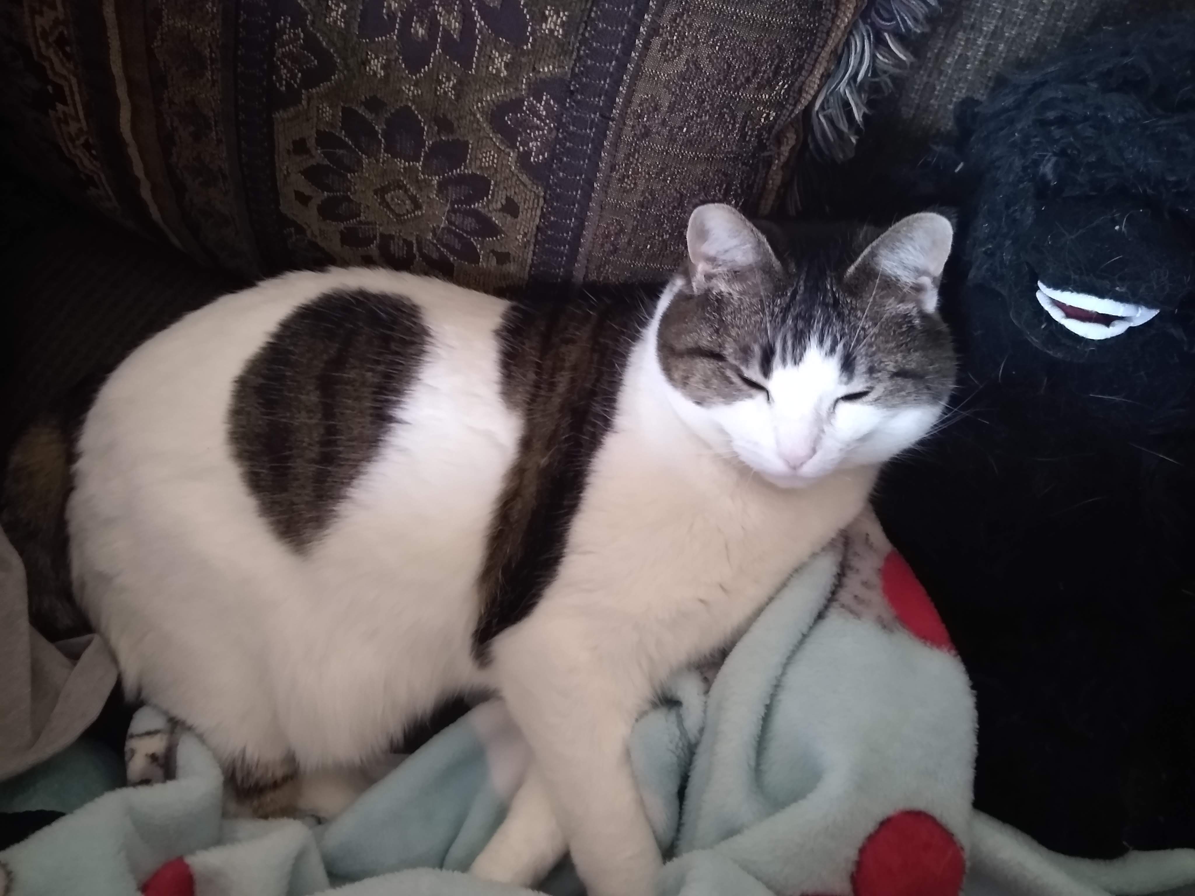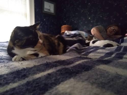9:35 after MAYBE receiving a few cuddles, Mom leaves us alone. (The young male human is in the house, but we almost never see him.)