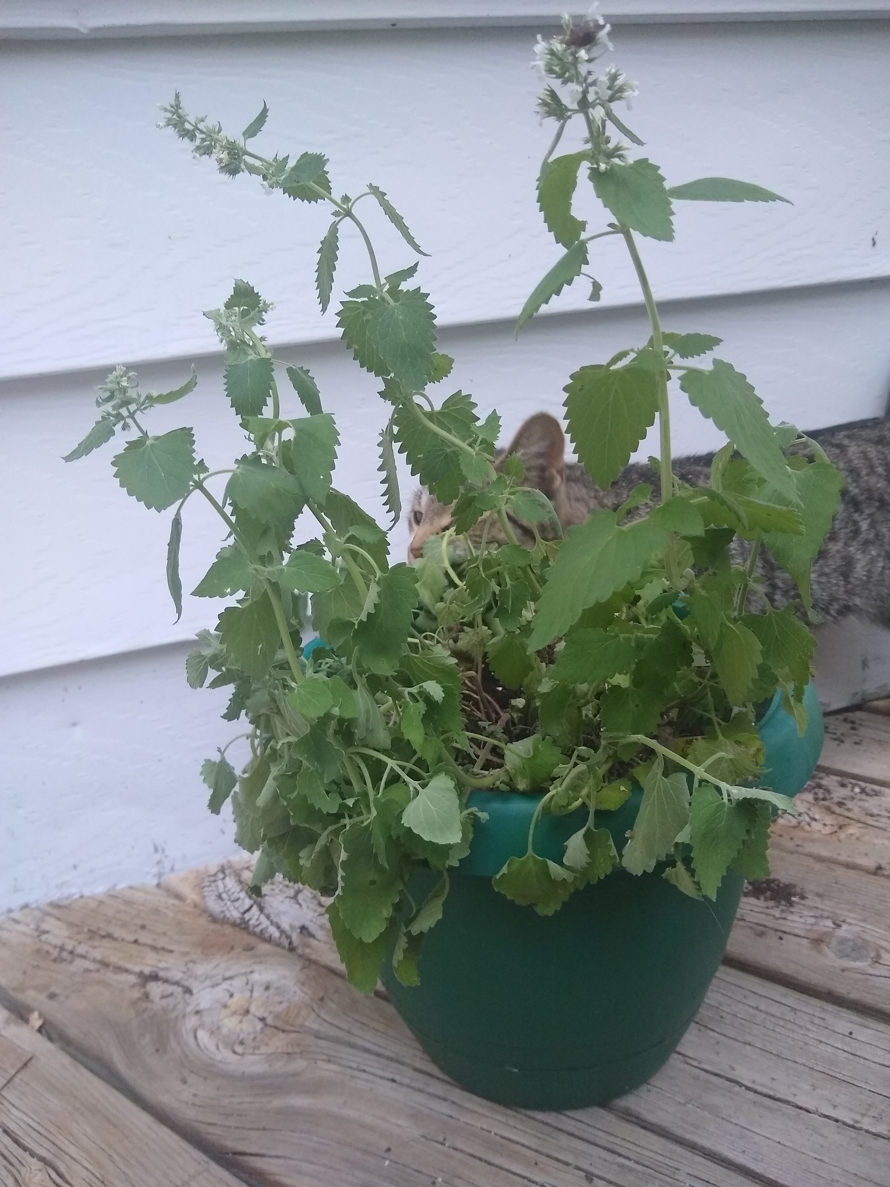 That was when the dastardly blackguard struck. One morning, we went outside, and the catnip was crushed! Something, or someone, had seen our innocent plants and decided that they needed to be taken down a peg. Once proud stalks were smashed, smushed, or smooshed. Leaves were torn and ragged, and dirt spilled from the sides of the previously neatly-kept pot. As soon as I saw the scene of the crime, I knew I would be the one who had to find some answers, even if I had a catnip mouse and a soft new bed on top of a cat tree in the window waiting.