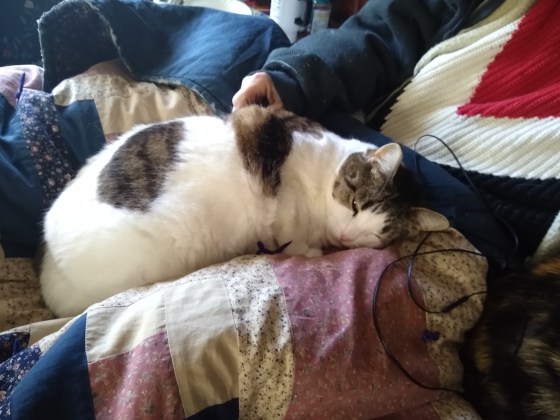 An mee doess ‘CAT Scanss’ on her….startin at her rite side bye feet an walkin along rite side to her head; checkin her with a paw on head an then movin down left side to her feet. If shee iss furry sick or inn alot of pain, mee doess it a 2nd time. Shee sayss mee CAT Scanss are wunderfull 😉