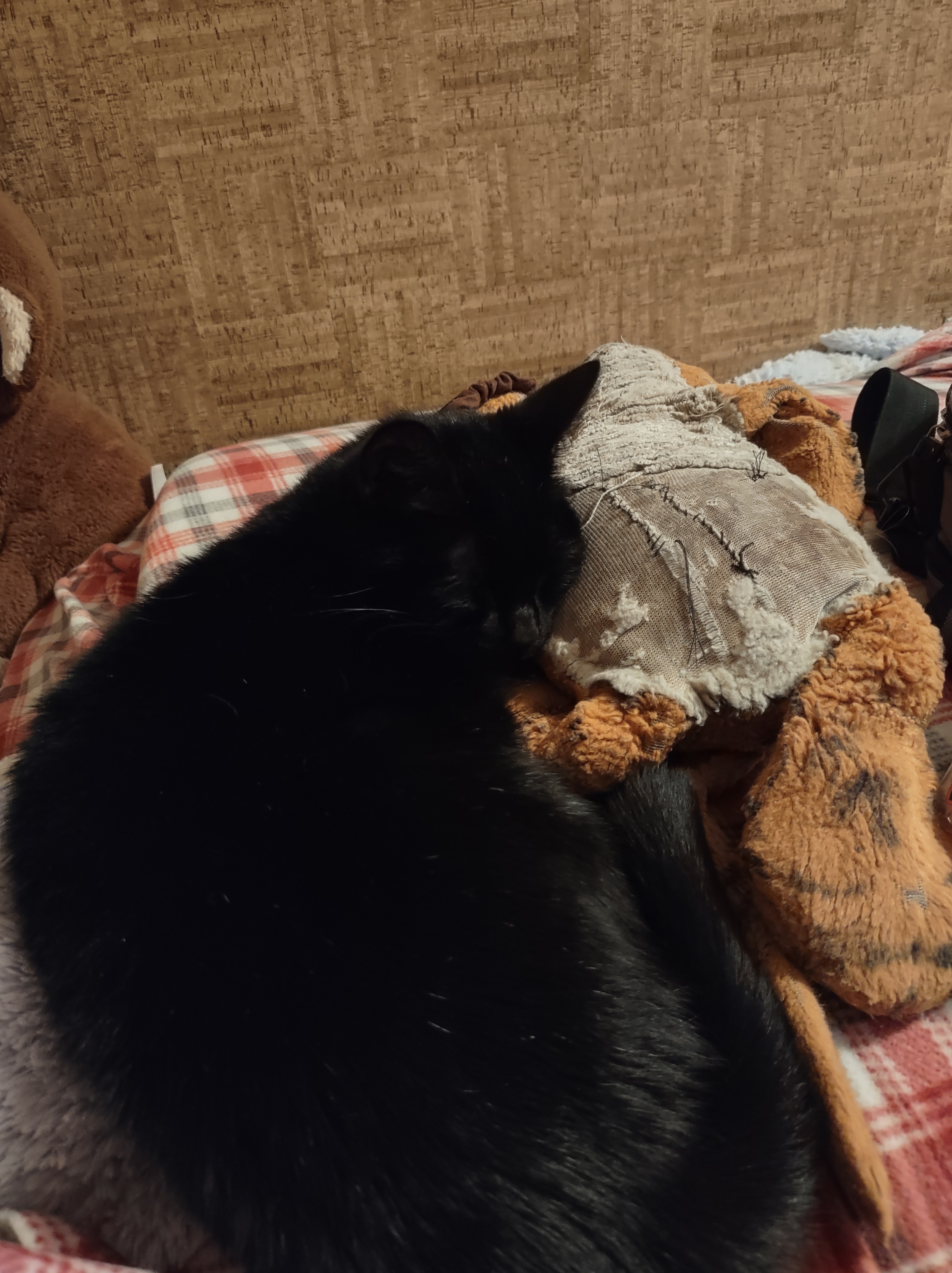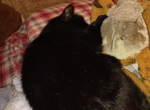 Then one of the new kitties moved upstairs. I guess she was supposed to be locked in one of the bedrooms until the humans had a chance to introduce us, but she escaped. She must be pretty smart. Her name is Onyx. She’s a really pretty black cat. And she smells really good.
