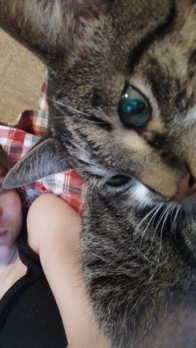 Mee-yow this situation ISS werkin out guud now! You have a new Hu’man frend Miss Blondie AN purrty Inyx who iss yore Couzin likess you! An 1 of THE Hu’man Kittss getss along with you….REESULT mee frend!!!!