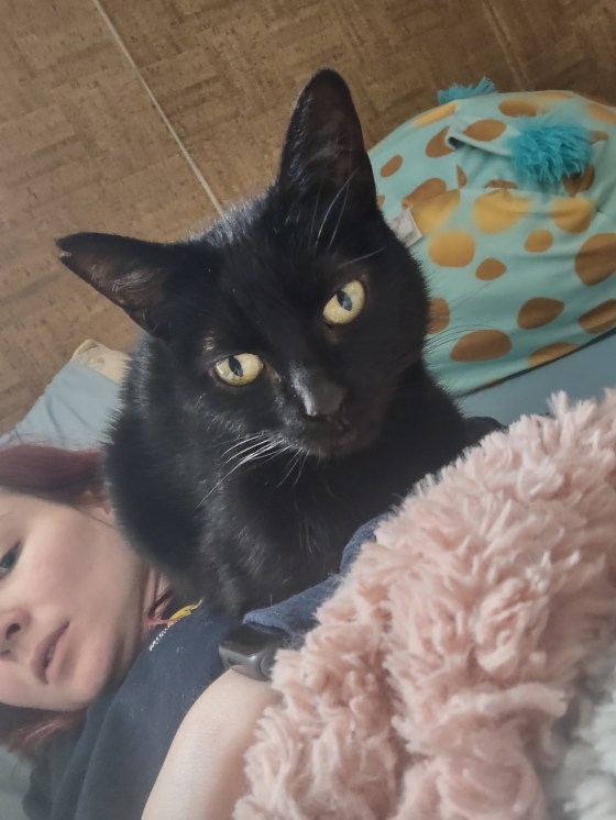 When I moved in, there were two downstairs cats: Snoops and Kommando Kitty. As you know, Kommando went over the Rainbow Bridge last month. Apparently, the original set-up was the Snoops bonded to the older male human, and Kommando bonded with Mom. Now, unfortunately, the older male human and Kommando are gone. Snoops is now Senior Cat in the house, so all the hmans give her cuddles and pets. But Mom’s pretty sad about what happened to Kommando.