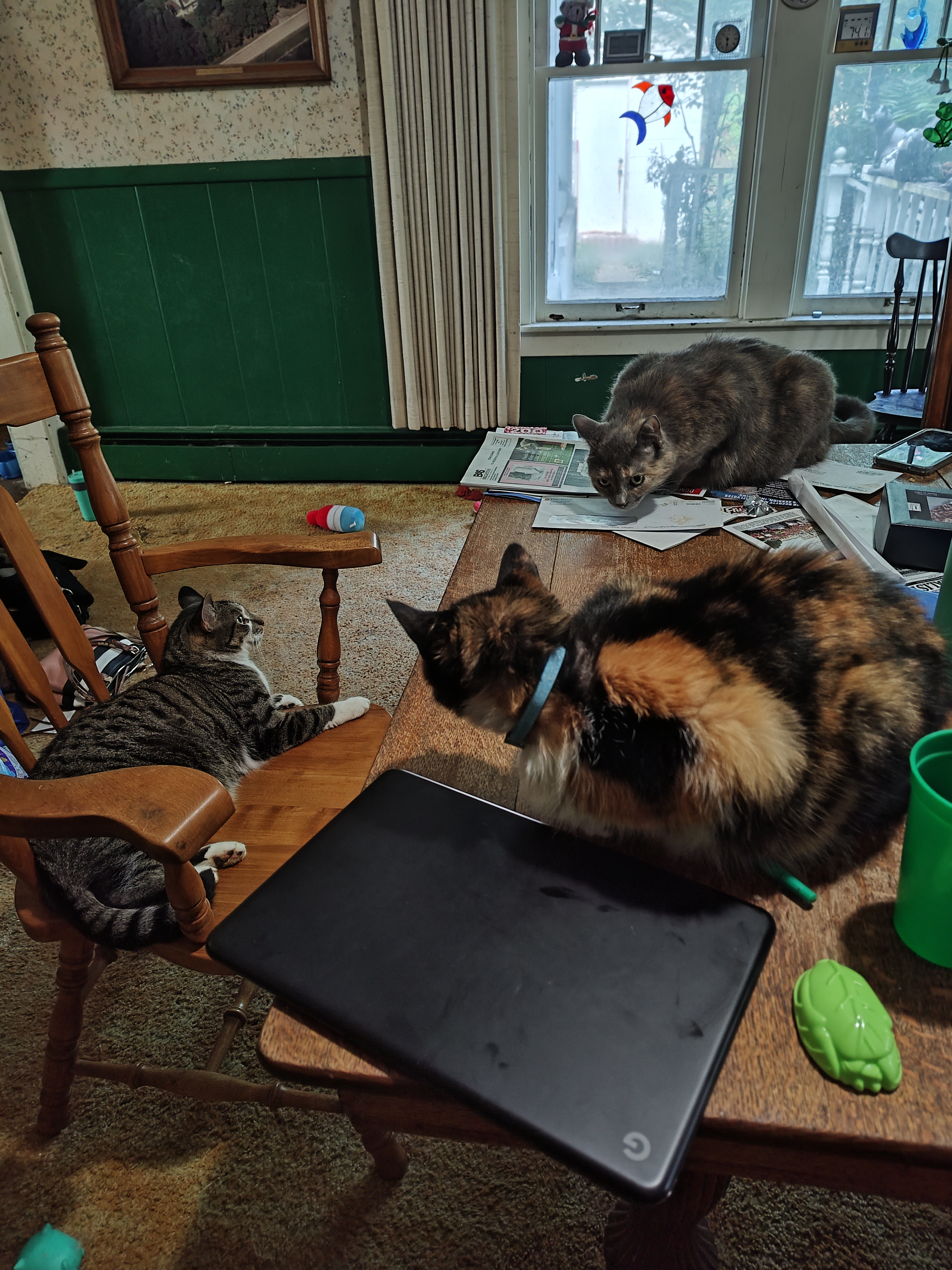 guyz…ther bee an eeazee peezee fix ta thiz…90 bowlz up stairz with treetz, water N chow, 90 bowlz down stairz with de same..purrson ull ree clinerz chairz for each oh ewe, yur own box filled with way awesum toyz anda vacationz for mom 😺‼️💙🐟💚