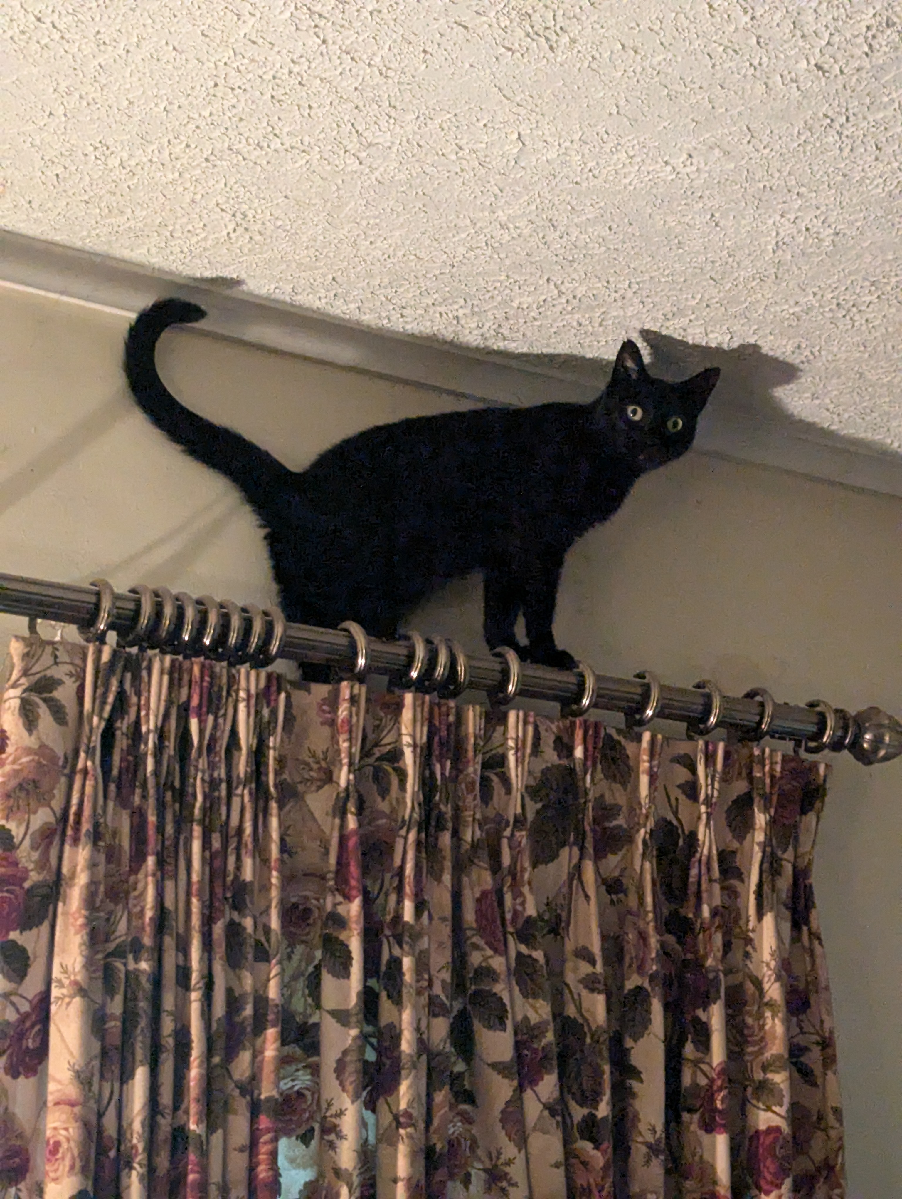 Katie sleeps a lot less with me in the summer. Onyx! Is that you on the curtain rod? N-A-U-G-H-T-Y!