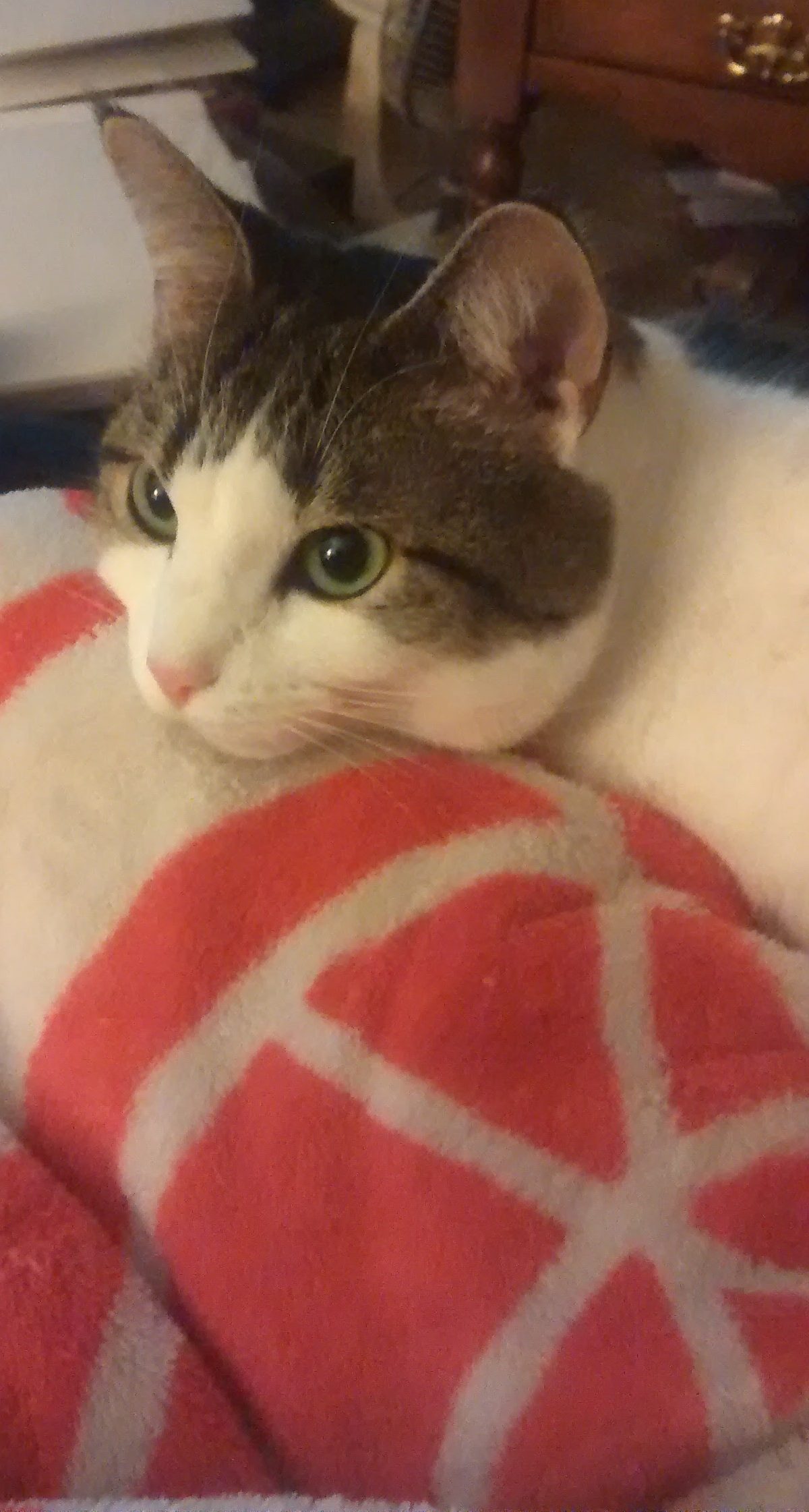 5. I just recently adopted a 12 year old kitty, Miss Emily. She needed re-homing when her human passed away. No doubt she is grieving. She’s slowly coming out of her shell, coming for pets, and proving to be fast at kibble-pouncing when it’s tossed across the floor. I await the day she will come for lap cuddles. Treatment is on-going.