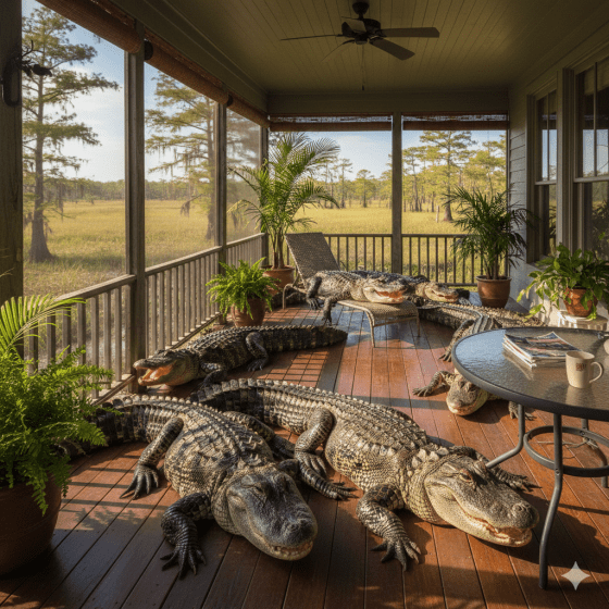 Amanda: And look at the sun porch. Plenty of room for a whole congregation of us to relax. (Ed. Note: Yes, that’s what a group of alligators is called.)