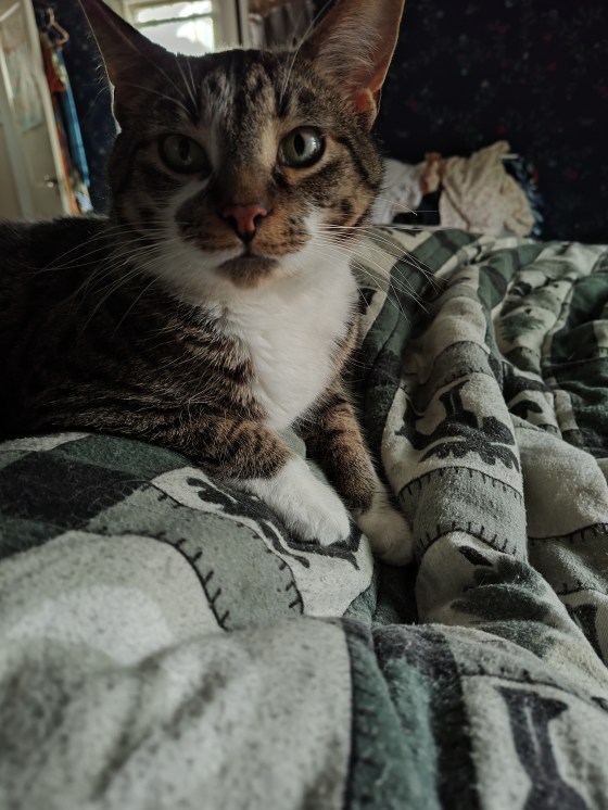 I’m over the fleas and have gotten used to the boys. (I even let them pet me if I’m in a good mood.) Mom says all of us cats have to start getting along. I’m fine with that as long as they don’t try to interrupt my cuddle time or eat all my food. Or get in my space. They should probably have their own toys. And their own human. And I get first dibs on the best sun puddles. I’ll keep you posted.