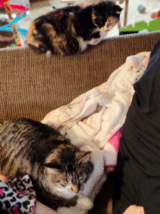 Angel: “No, I also purr, give her kitty kisses and head bonks, and, of course, I share in her snacks. I work hard; I deserve a treat.”