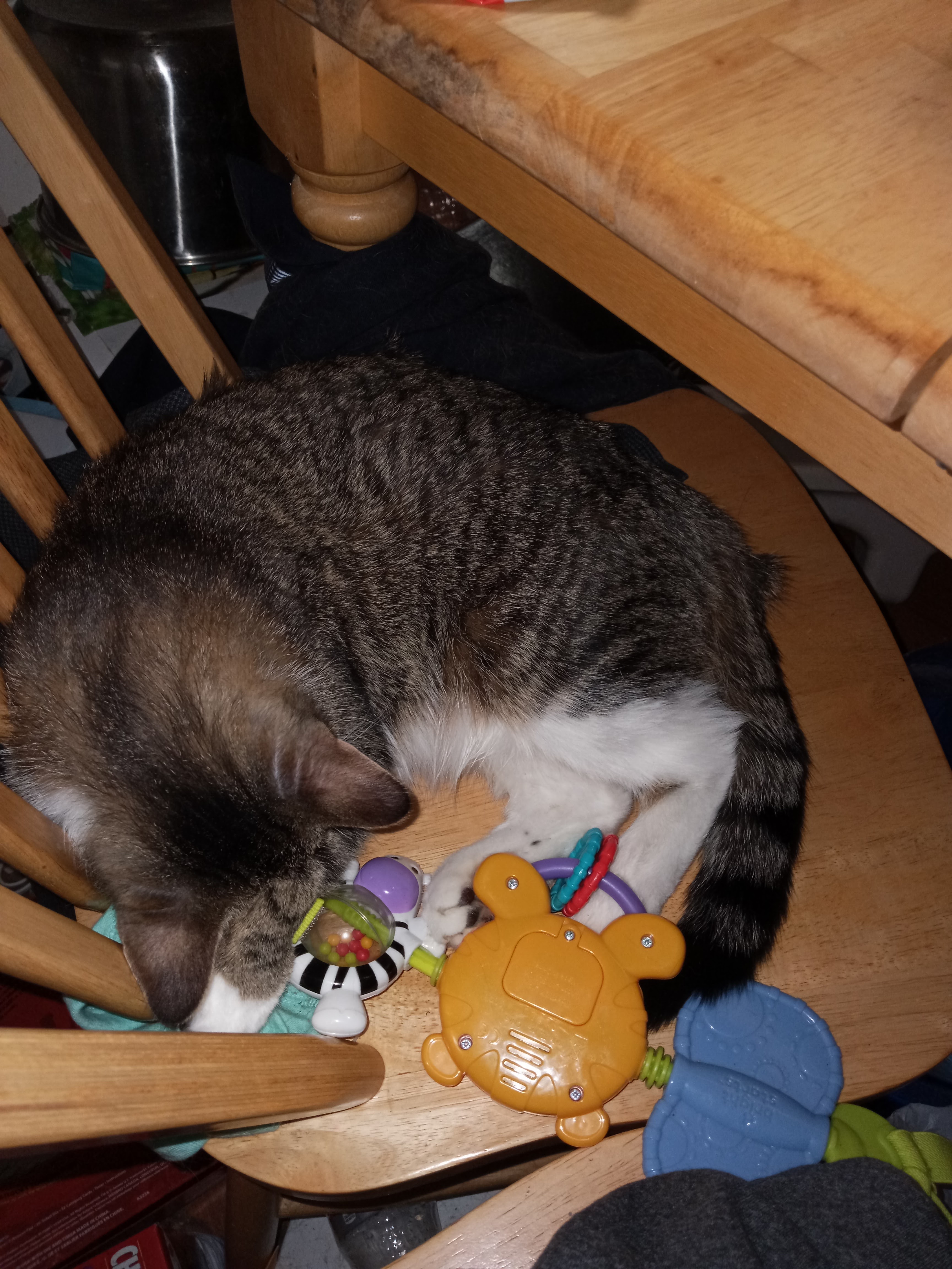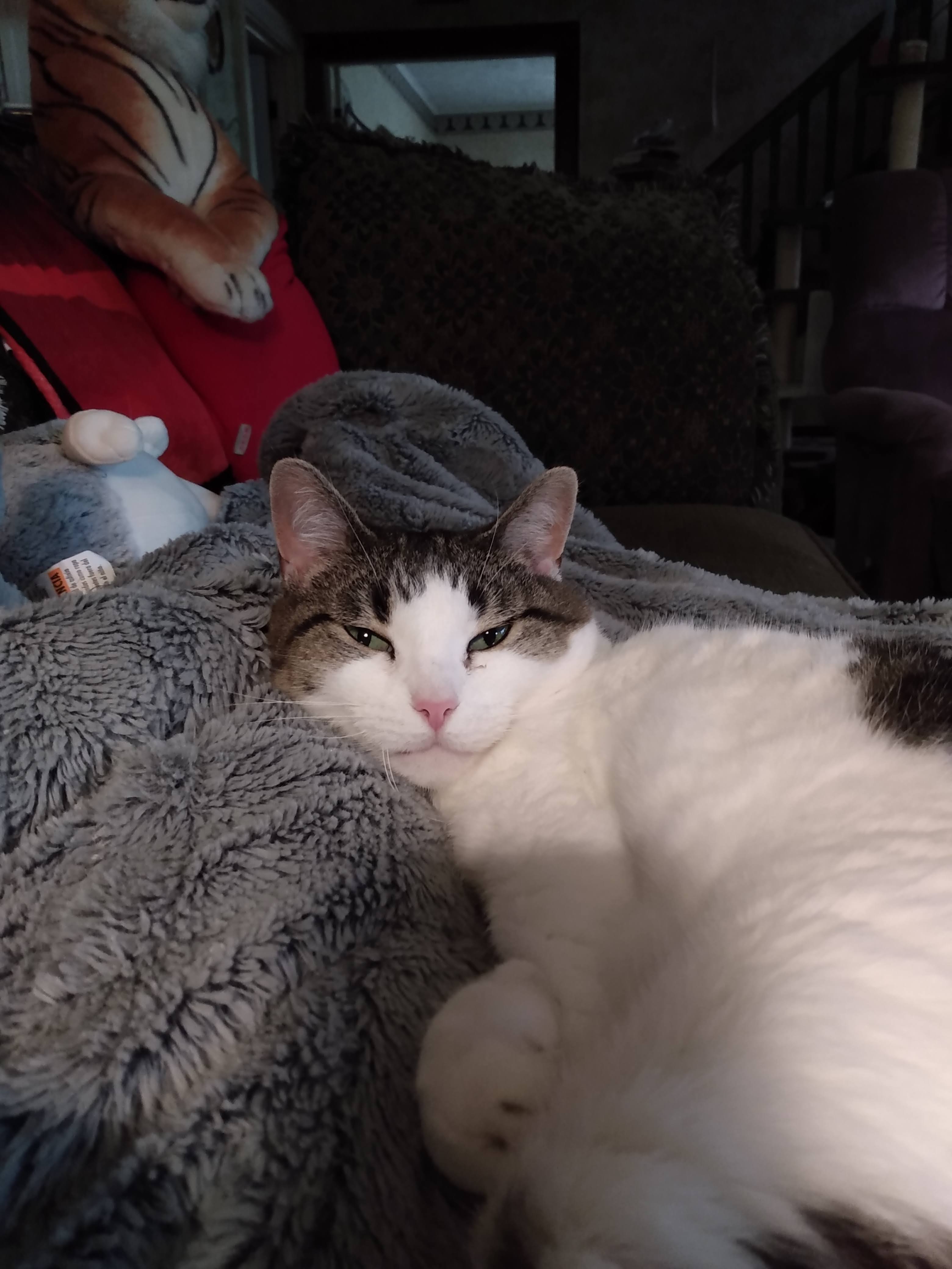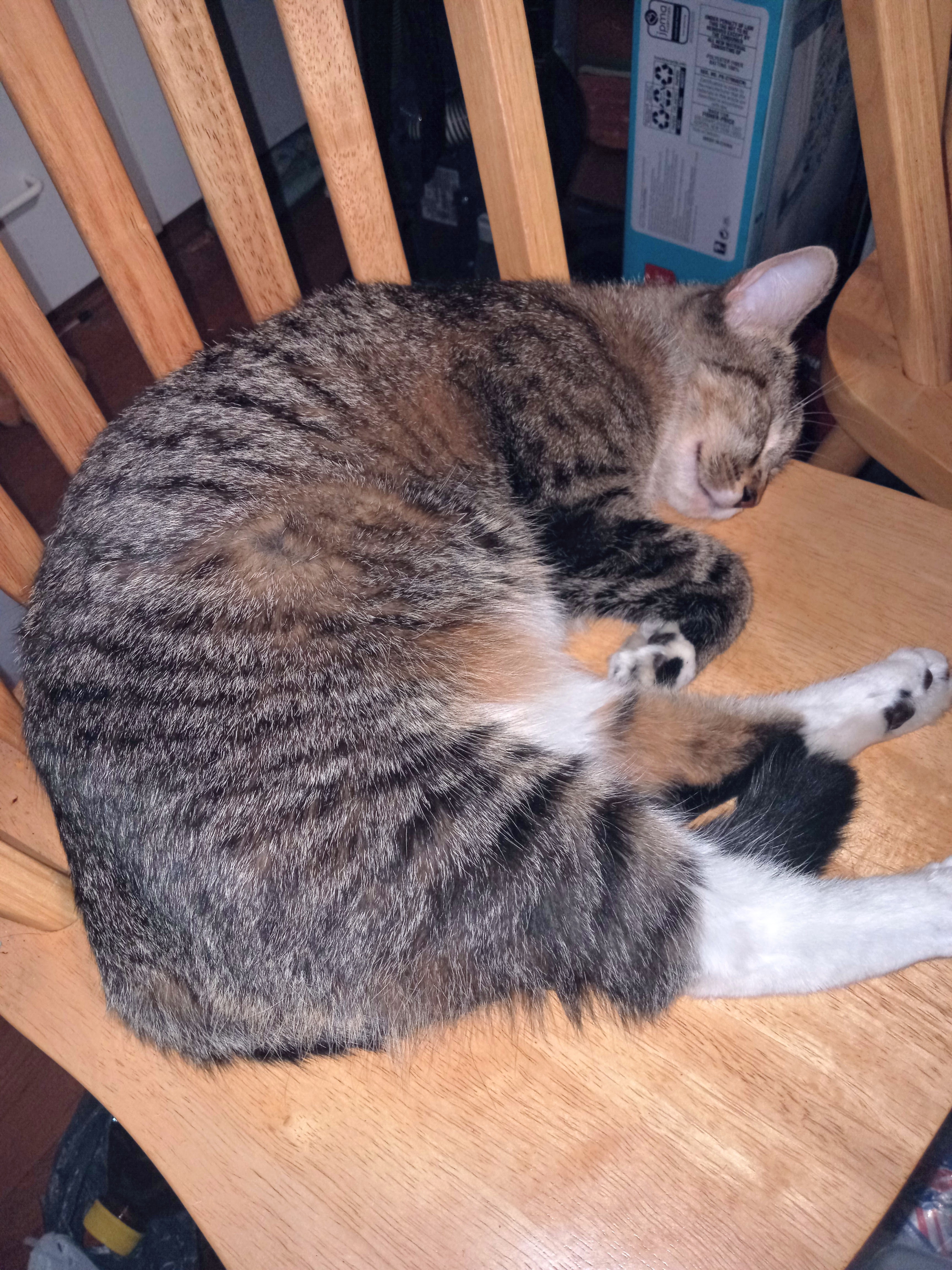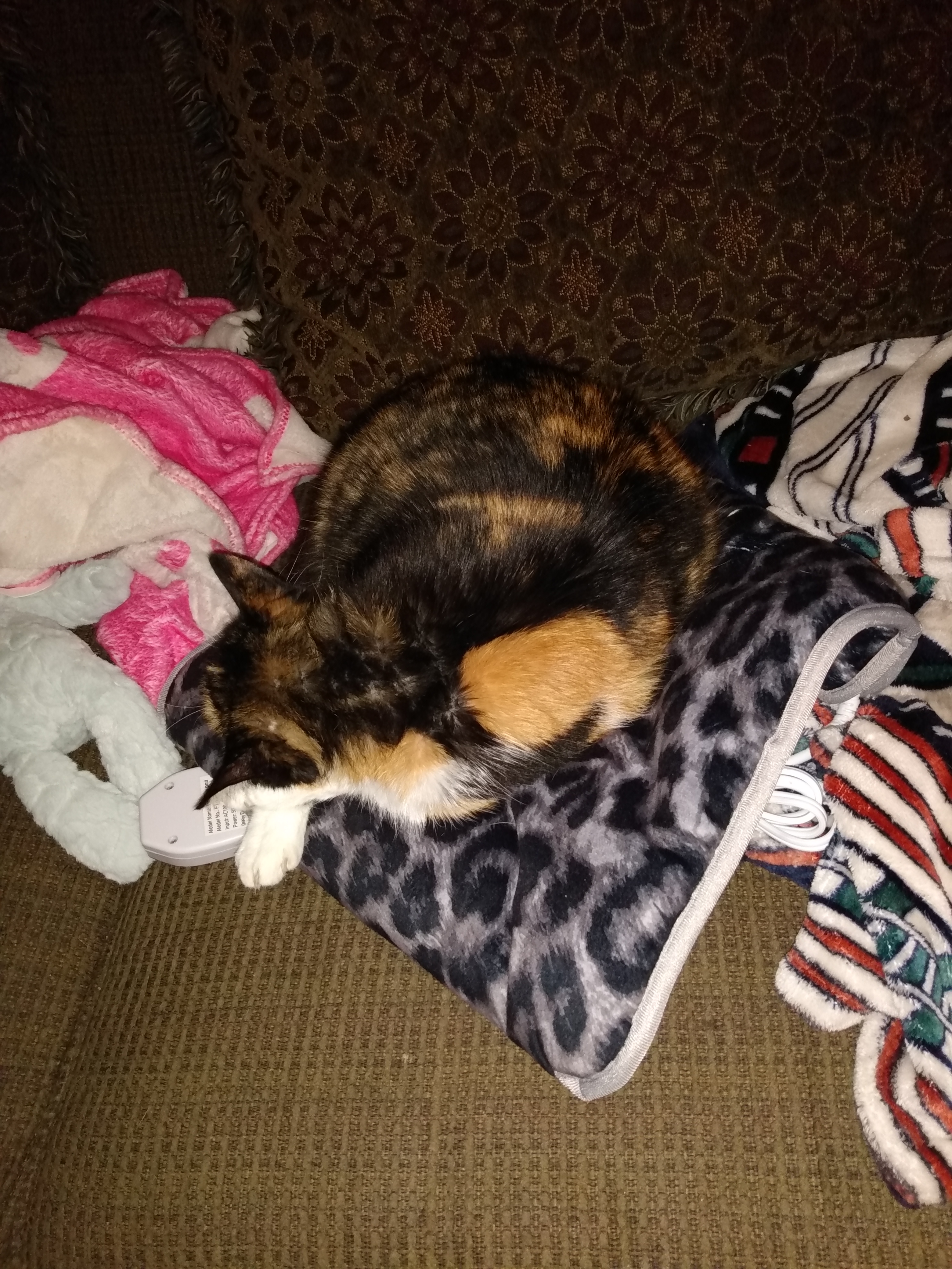 The ladies and I have been sharing nurse duties. Upstairs, I have been assisted by one of our newcomers. Not Onyx. She remains aloof and stand-offish. My aide is named Gypsy. She is a beautiful dilute calico. Snoops and Kommando have been handling the downstairs duties. We make sure that she is never cold or lonely. We also still let her feed us so she doesn’t feel useless. (She’s not doing much else.)