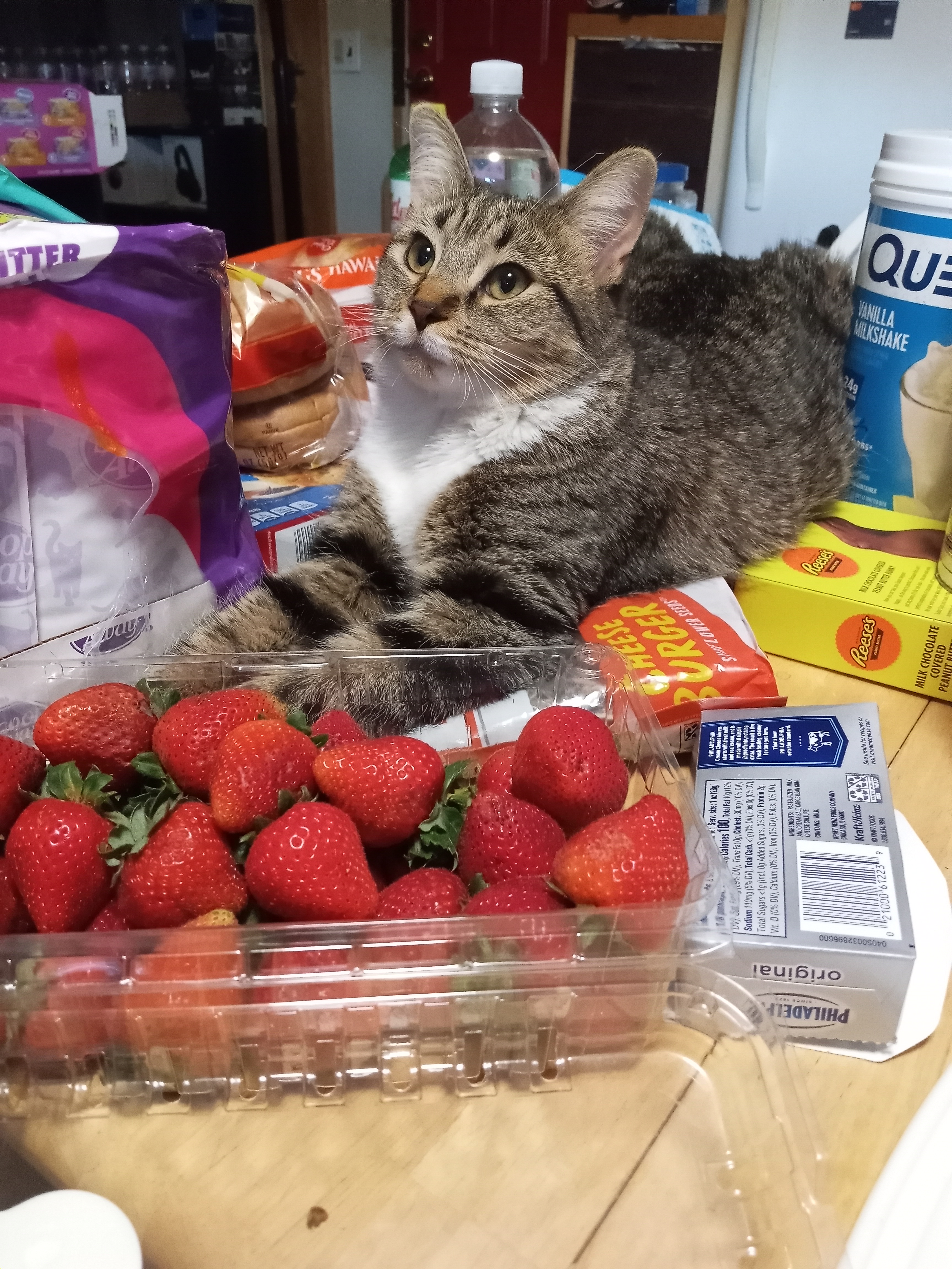 Cherries are actually not really recommended for cats, since they are considered a stone fruit due to the pits. These puts not only prevent a choking hazard, but we cannot digest the pit if ingested. However, Angel keeps licking the meat of the fruit, which seems to be okay (she typically only gets one or two; we don’t want to risk making her sick). Assuming you avoid the pit and stem, cherries can benefit cats by offering the typical vitamins (A, C, and K), along with magnesium, calcium, and antioxidants. These sound like a great idea when your human brings home the office cold and wants to snuggle right up with you!