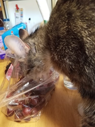 I discovered grapes for the first time about a week ago. They’re wonderful! Not only are they small enough to bat around, they’re cool, which helps with the summer heat. They come on a cool stem/vine that you can chew on (Mom won’t let me do this, but when she isn’t looking it’s fun)! You can pounce in the bag they arrive in for hunting practice. And, best of all for our health, in addition to carbs and protein, grapes also have an abundance of vitamins A, C, and K, as well as thiamine. They also provide a small amount of iron and calcium. I would definitely give grapes a try if you haven’t already.