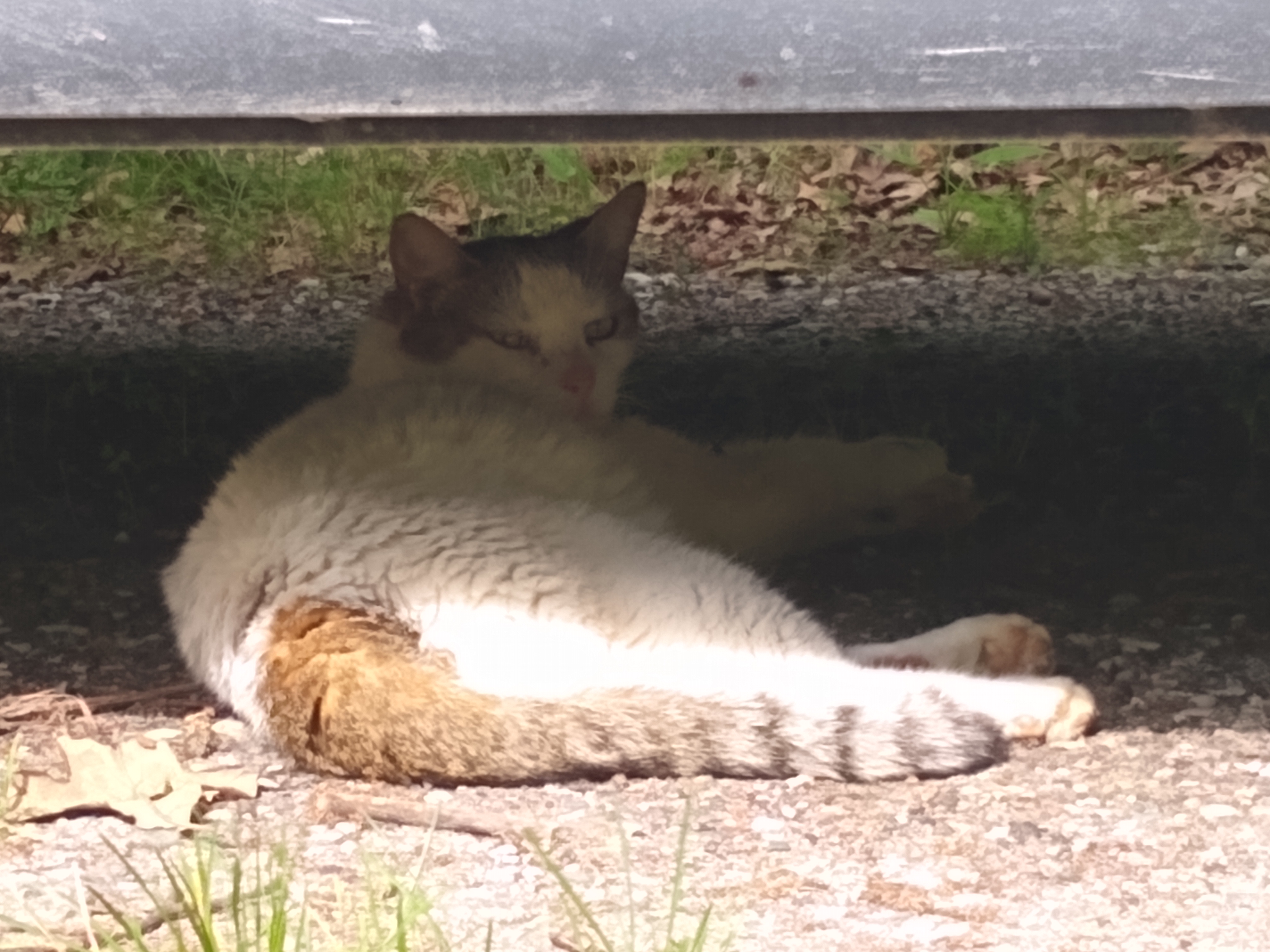 Ed. Note – No one has gotten close enough to know the gender of the cat. We call it “she” for convenience – “it” seems kind of rude. Kommando just appeared at the window well one day. It is possible that this cat is related to her.