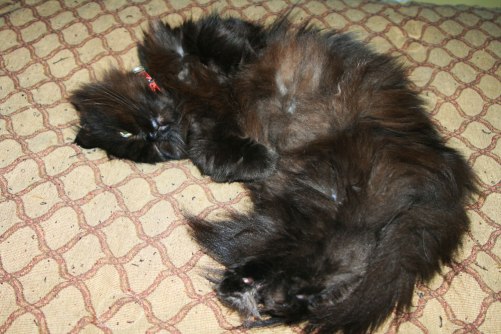 I’m doing one of them right now – I’m curled up on the sofa, relaxing with Mom and Dad while they watch the moving pictures on the black box. I also like to keep a watchful eye on the perimeter, as my yard tends to attract many foul, feathered beasties and thieving squirrelygigs. If I think something is amiss I send out my minion to run them off. I also silently serenade my Tortie neighbor through the glass some days even though she doesn’t return my affections. I also enjoy good long baths of my own making. They relax the soul and keep me smelling fine.