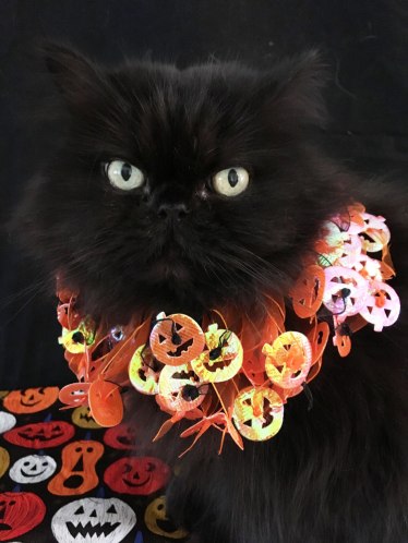 Oh, thanks for asking! I love All Hallows Eve! It is something I look forward to every year and I count down the days on my catlendar. And even though I’ve heard it is not a safe time to be a black pussy cat outside on that particular holiday, I enjoy it by staying perfectly safe inside with my family. I keep watch at the door for spooks, zoms, and cursed mousies, don’t you know? It is also my job to greet the lil’ beings that come for candy treats. They marvel at me as I peer at them through the window. Sometimes they ask about me, too. I’m sure if they had their wish they would rather be pussy cats instead of children and why would they not, right?!