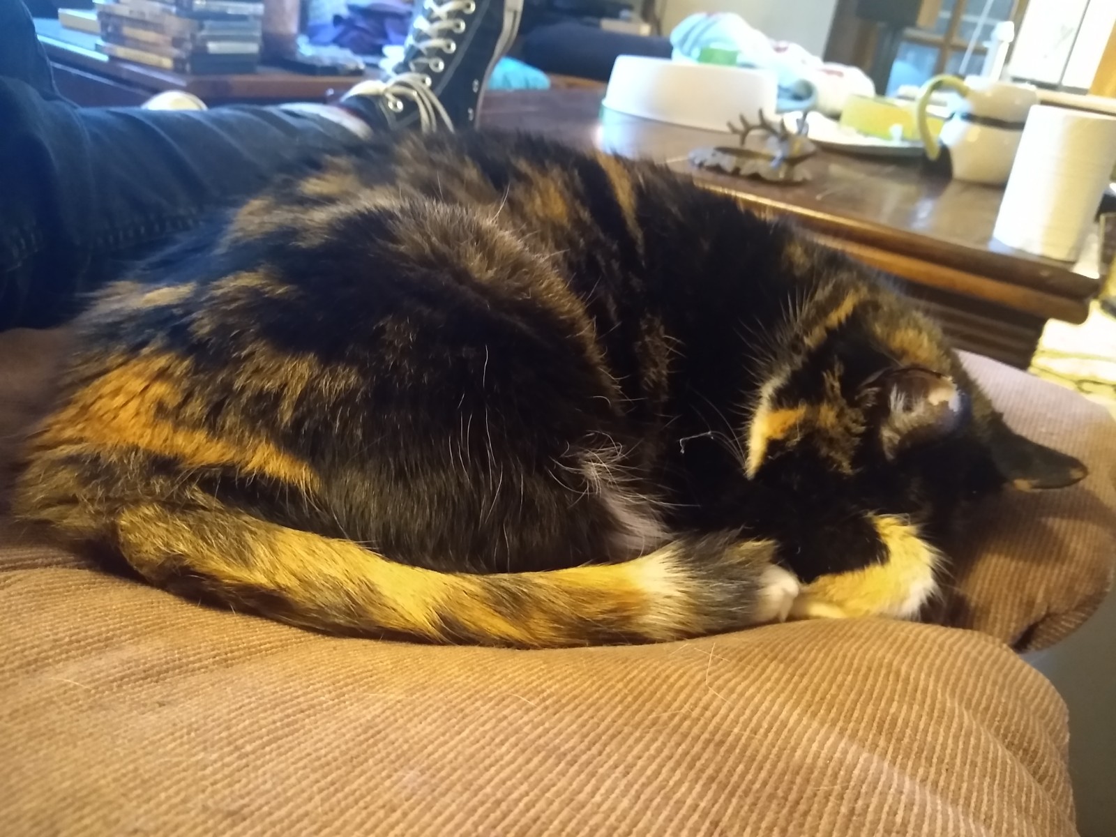 Angel: The male human is pretty attached to Sgt Stripes. And I just can’t get comfortable sitting with Human Mom, for some reason.