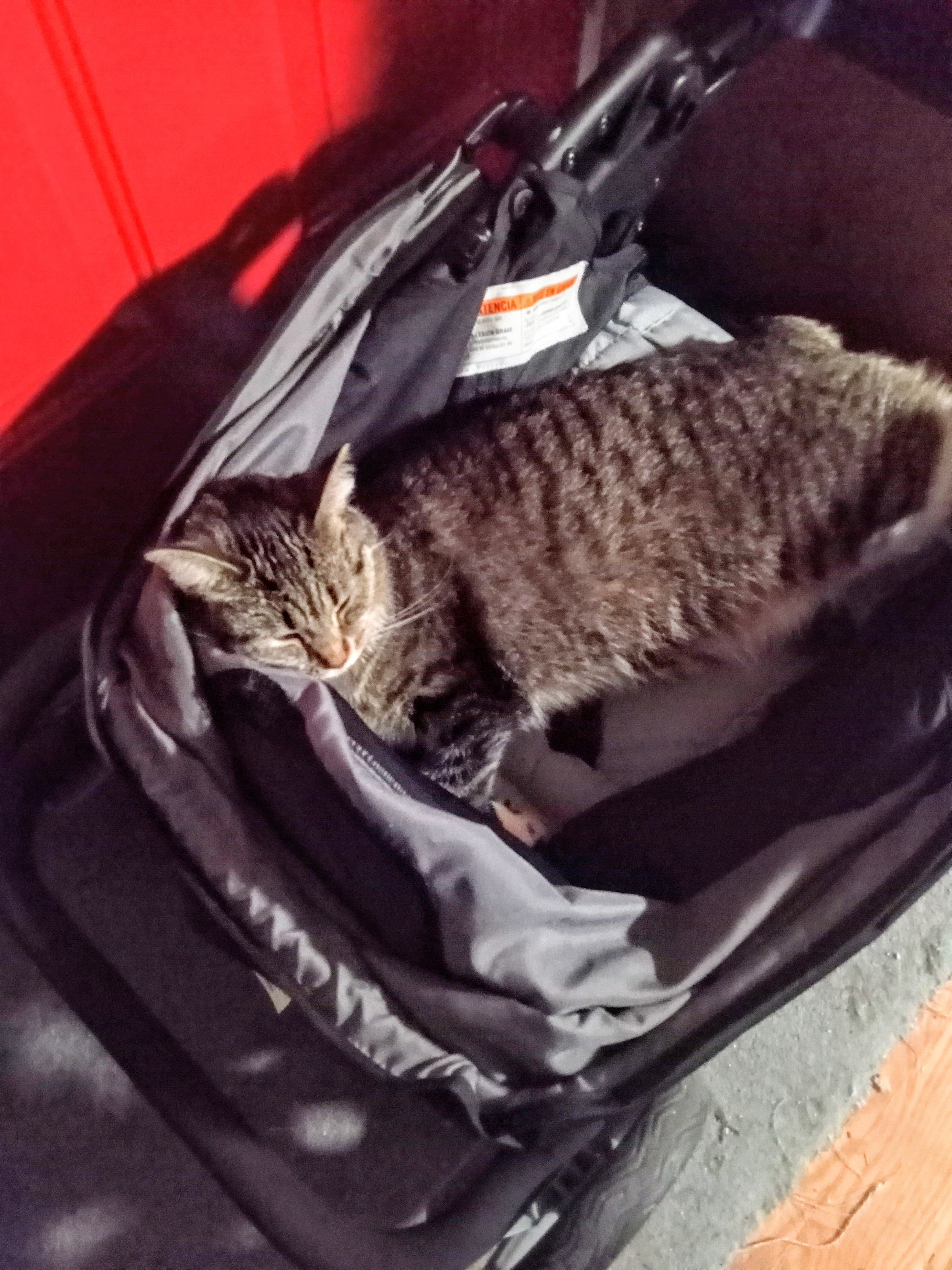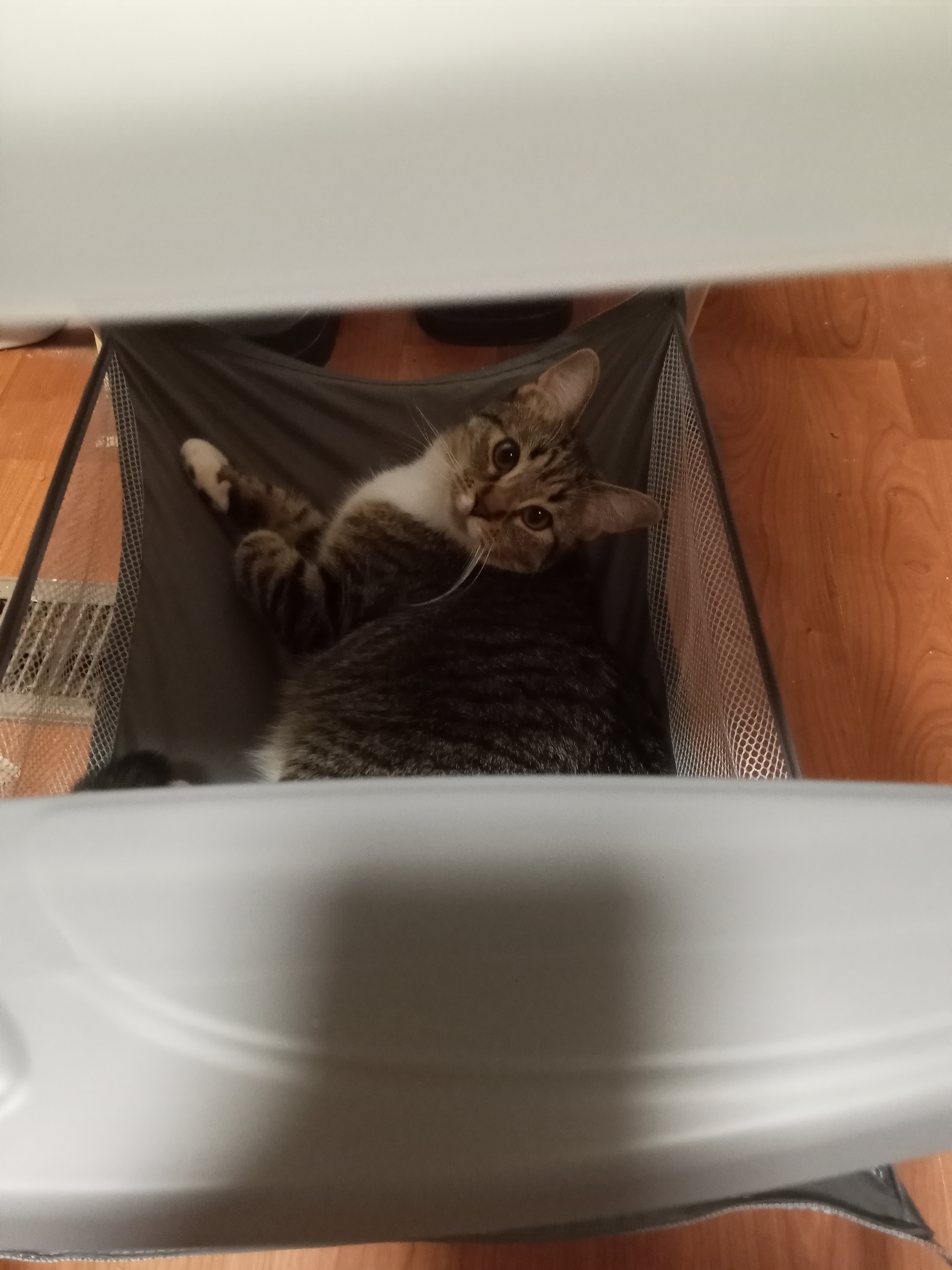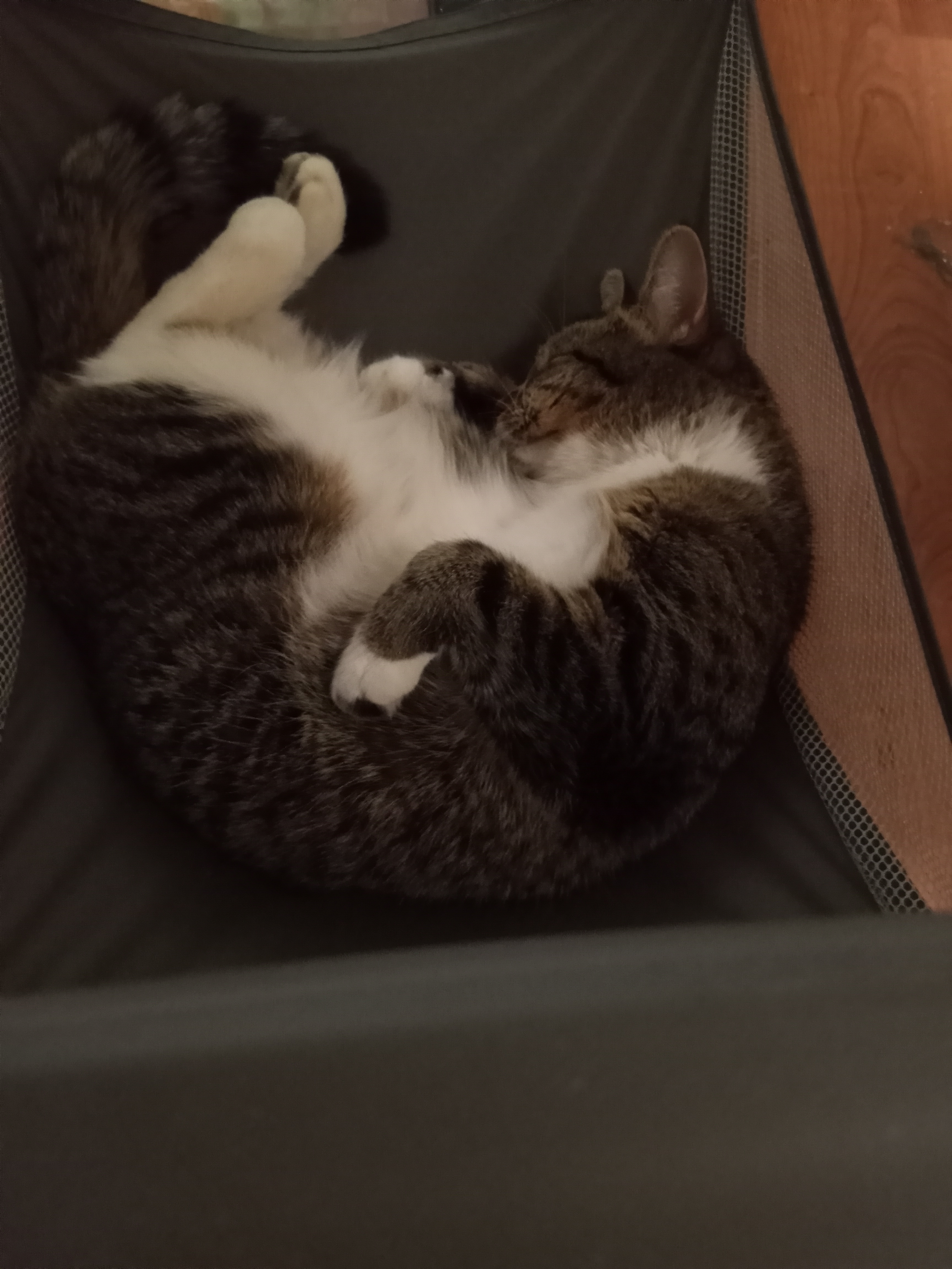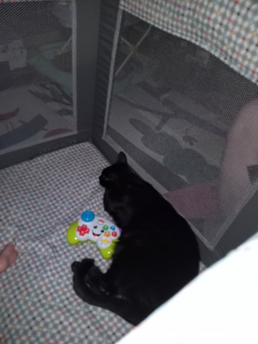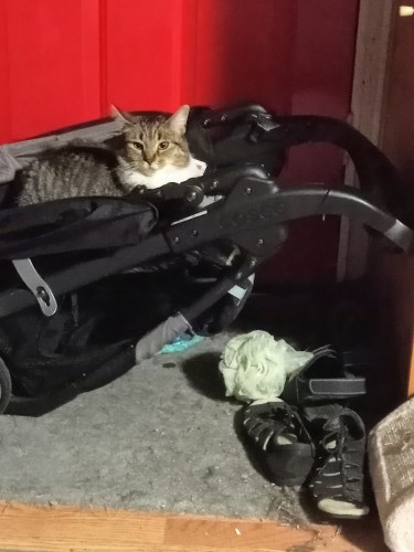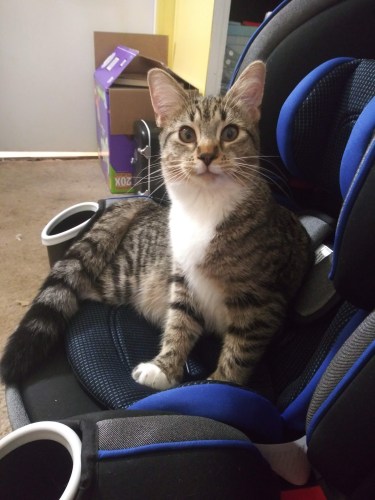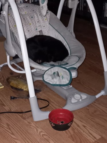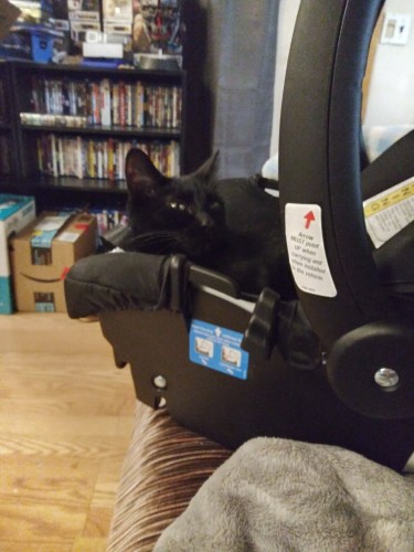 This has proven to be a wonderful asset to our house. Despite it smelling like the human kitten, a cat can curl up for a nap, play with the straps, or cuddle with the human kitten if he’s still in it. As an added bonus, there’s often a soft blanket tossed in it to keep everyone warm!