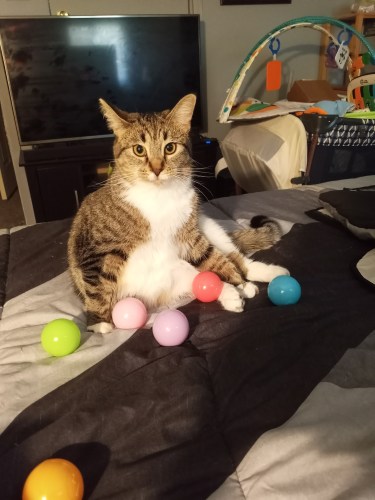 Human kittens have tons of cool toys to swat around! Balls, little cars, stuffed animals, things with pushy buttons and moveable parts… and they’ll usually play with you! I’ve been able to train my human kitten to play paws through his desire of pushing a ball back and forth with me!
