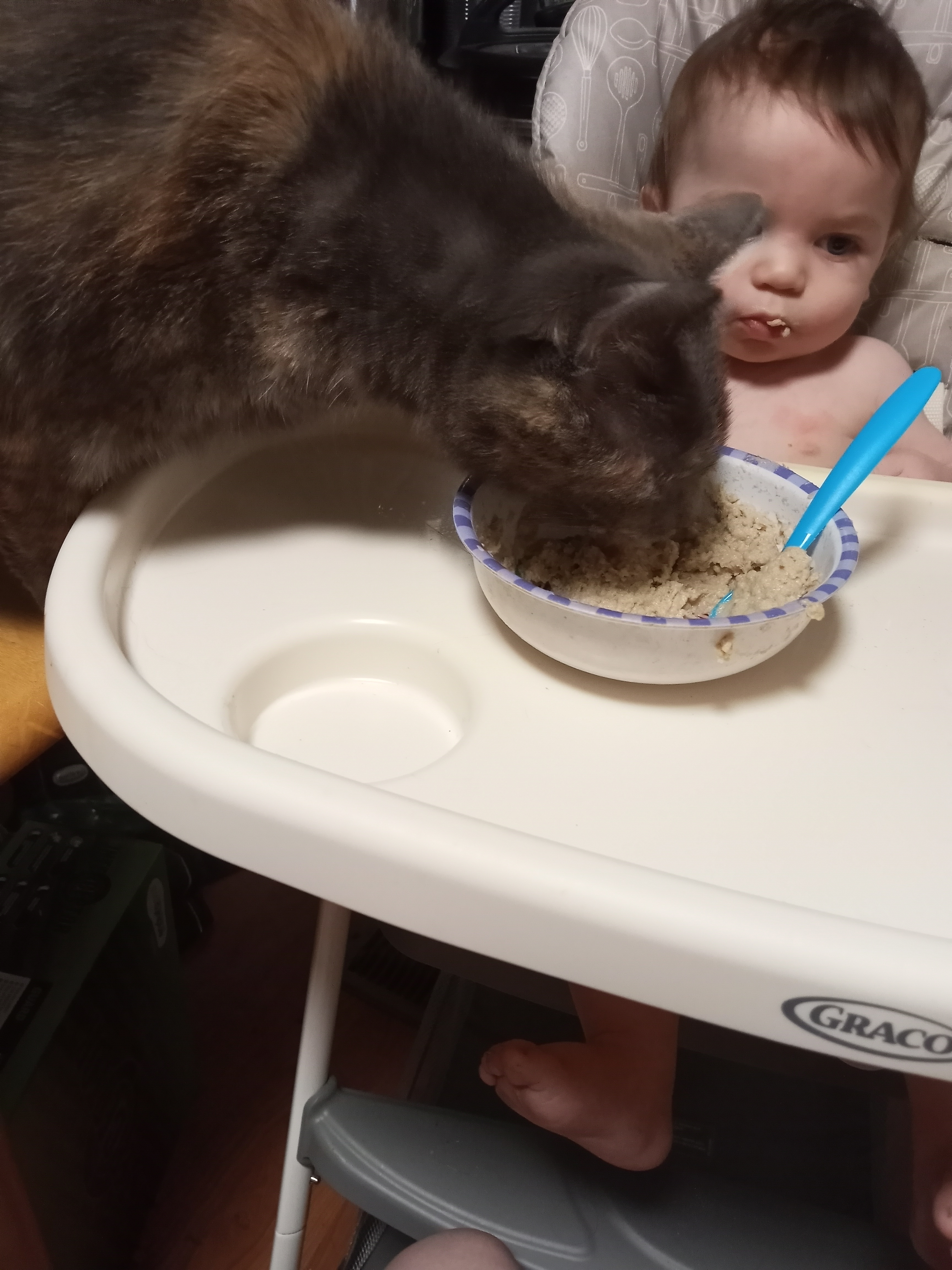 I need to start by emphasizing the “some” part of this, as babies tend to eat yucky foods like green beans and peas. However, they also drink this wonderful concoction called “formula” (our human kitten has to drink the dairy-free version due to an allergy, but it still tastes good). They also have cereals that some kitties may enjoy. And, we recently discovered that older babies get meat mixed in their purees. Just really sniff before licking, as there are some very gross flavors out there.