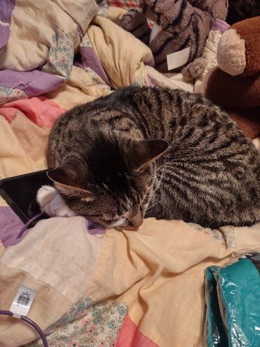 Blondie returns home. She gets our laptop out, and makes sure that it and our work cell are charged. She also gets her notepad ready. This is usually when I do my big kitty stretch and prepare myself for another strenuous day.
