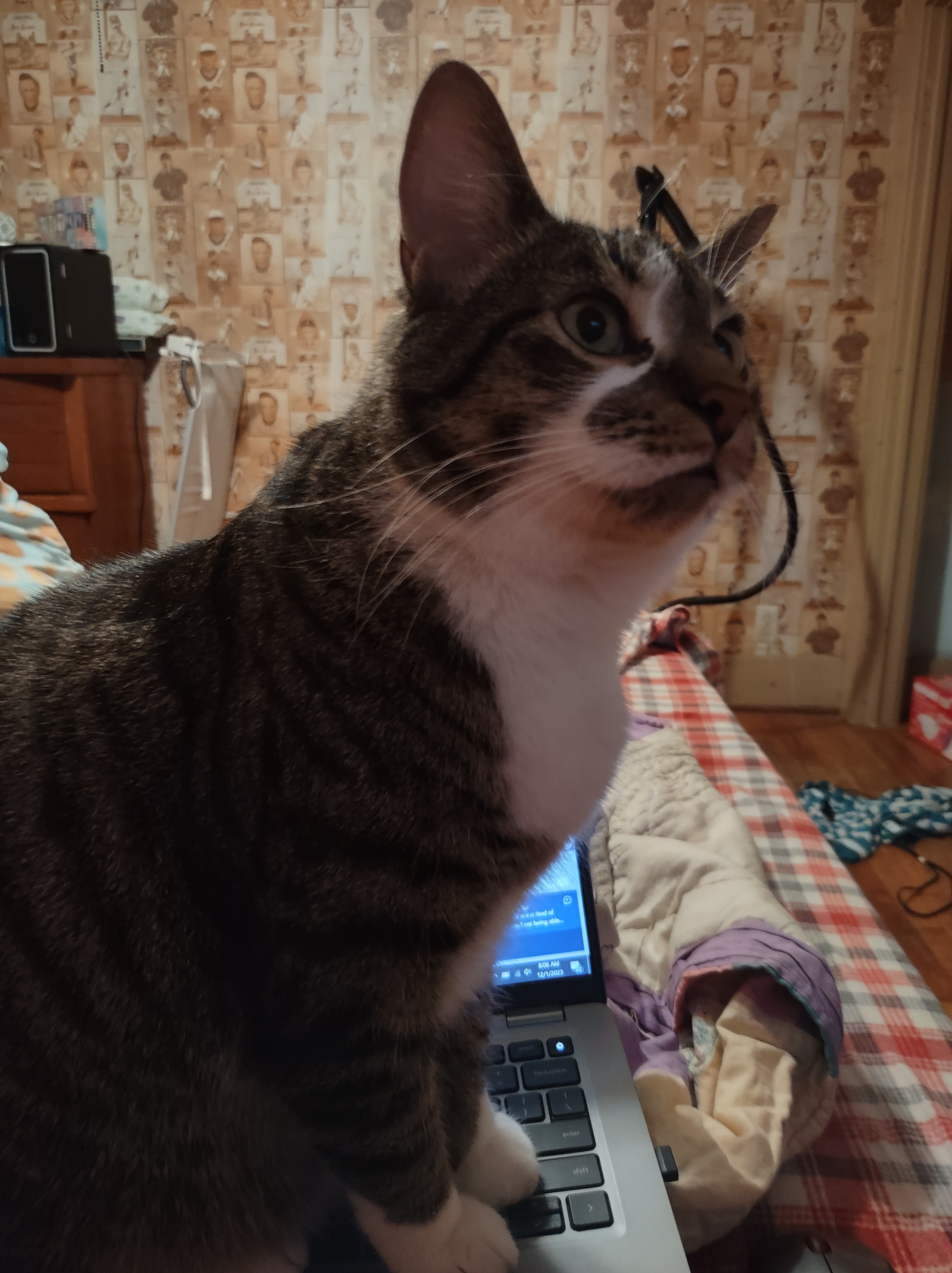 Blondie returns home. She gets our laptop out, and makes sure that it and our work cell are charged. She also gets her notepad ready. This is usually when I do my big kitty stretch and prepare myself for another strenuous day.