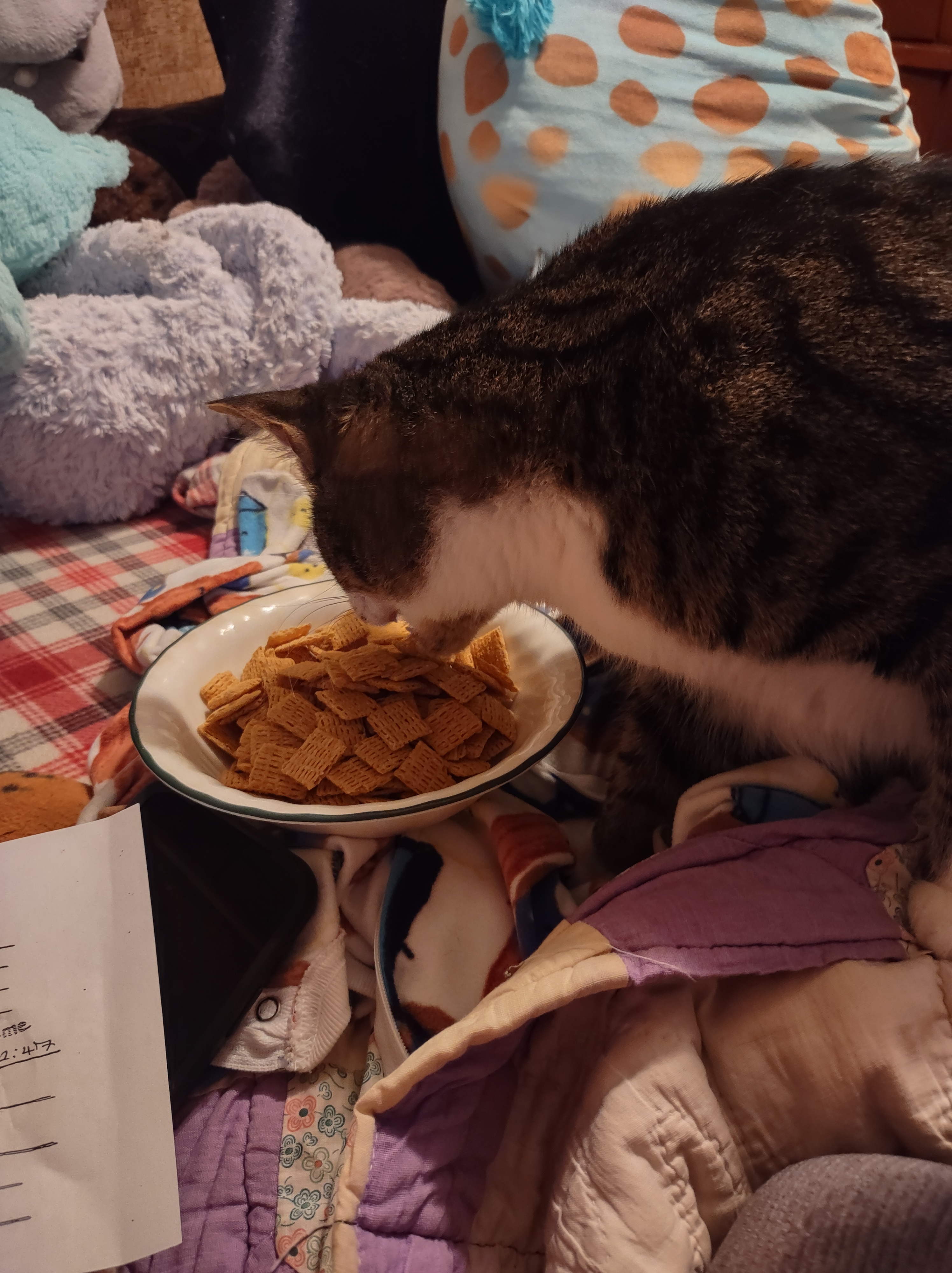 Lunch break! Usually Blondie goes downstairs and gets tea and a sandwich, but I get to chow down on kibble (or cereal. She eats cereal and we share sometimes). I’m hoping my employee of the year luncheon features vole. I really like vole, But after I eat, I usually use the facilities, stop by the scratching post, and get a nap in.